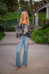 A flowy, long sleeve bohemian blouse in a black and ivory abstract print.