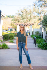 SHORT SLEEVE BUTTON FRONT BLOUSE - FOREST GREEN