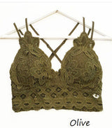 Beautiful crochet lace bralette, pull over style, long line, all day comfort, v neckline, removable bra pads, criss-cross straps at back, adjustable bra straps, and perfect amount of stretch.