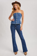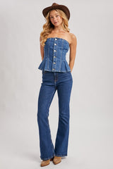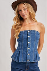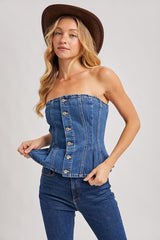 DENIM PEPLUM CORSET TOP - MEDIUM WASH
