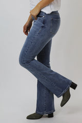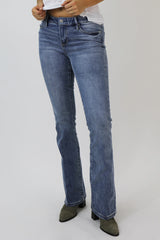 Mid rise bootcut jeans.
