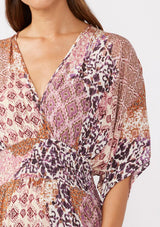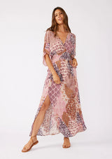 Fall head over heels for our stunning new maxi dress, featuring a beautiful dusty pink patchwork print and a flowy silhouette. This free-spirited design features kimono sleeves, a smocked waist for definition, a sexy open tie-back detail, and a flattering v-neckline to ensure you look fabulous from every angle. Versatile and stunning, this dress transitions effortlessly from day to night, making it a must-have for any occasion.