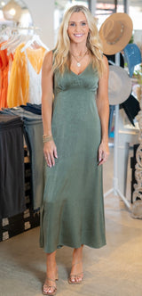 Introducing a simple dress you'll be wearing all the time, The Martine Dress. Made from hammered satin it has a slim fit and a flattering v-neckline. It has a self tie at back to cinch in the waist and hits at mid calf.