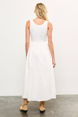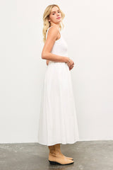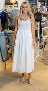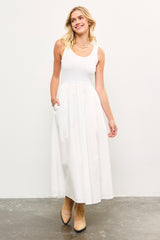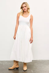 SCOOP NECK SHIRRED WAIST DRESS - WHITE