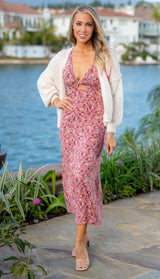 Romantic with a twist, this floral midi dress features a knotted tie detail and front cutout for added intrigue. Crafted from sleek rayon spandex jersey, it’s midweight and effortlessly flattering with its v-neckline and short sleeves.