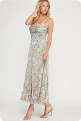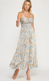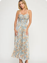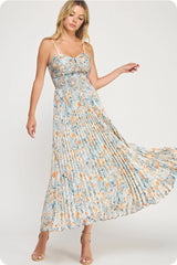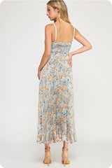 FLORAL PRINT PLEATED MIDI DRESS - BLUE MULTI