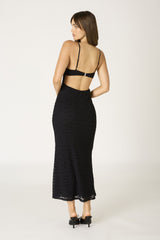 This lace maxi dress features a slim fit with delicate spaghetti straps, a square neckline, and an open back with a clasp closure.