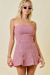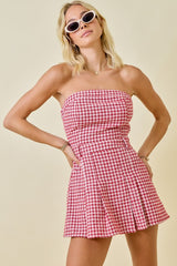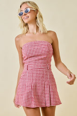 CHECKERED STRAPLESS MINI ROMPER/DRESS - RED/CREAM