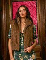 The Liana Vest is made from a special braided, faux fur. It has a relaxed fit, zipper front and ribbed hem.