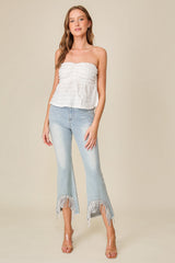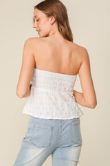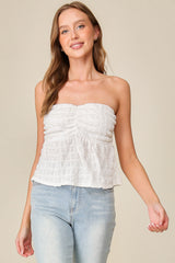 Add a touch of charm to your wardrobe with this strapless sensation! Crafted from textured knit fabric, it offers both style and comfort. The baby doll silhouette creates a playful vibe, while front ruched detail adds texture and dimension. Turn around, and you'll find a back elastic trim ensuring a perfect fit. Whether you're out for brunch or hitting the town with friends, this top promises to dazzle with its creative design and whimsical flair.