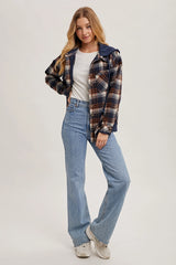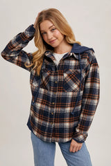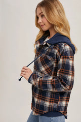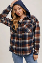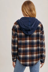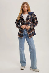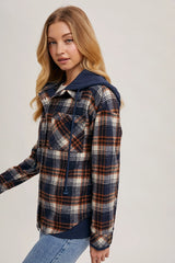 BUTTON DOWN HOODED PLAID JACKET - NAVY