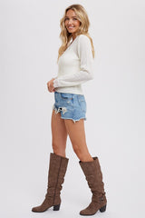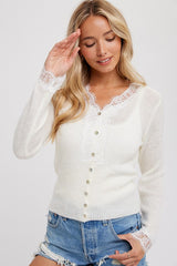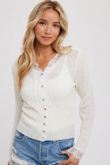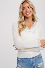 BUTTON FRONT LACE KNIT TOP - IVORY