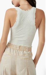A baroque-inspired jacquard pattern and lettuce-edge trim enchant this fitted, crop top that's equally perfect paired with lazy lounge looks or when going out.