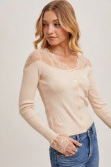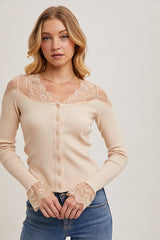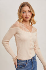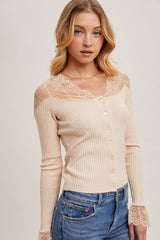 The lace-trimmed button-down knit top offers a blend of elegance and casual comfort. This top features delicate lace detailing along the neckline and button placket, adding a feminine touch to its classic design.