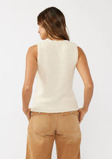 This laid-back boucle sweater tank is made for those breezy spring days. With its airy open-knit design and soft, textured feel, it’s perfect for layering or wearing solo. Whether you pair it with jeans or a skirt, it’s the ultimate easygoing piece for laid back occasions.
