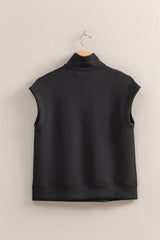 Look Your Best In This Trendy Top. A Mock Neckline Leads To Half-Zip Up Detailing And A Sleeveless Cut Bodice. The Top Features A Slightly Snug Fit And Ends In A Banded Hem. Pair With Wide Leg Trousers.