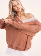 Oversized Light Weight Waffle Sweater featuring a low V neckline, lantern long sleeves with dropped shoulders for a cozy flattering look. Added stitch detailing all over to keep things more interesting and cute.