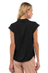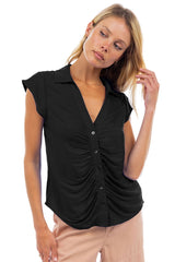 RUCHED BUTTON DOWN CAP SLEEVE BLOUSE - BLACK