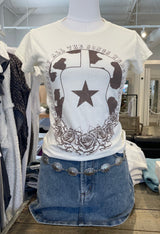 'And suddenly all those country songs were about you"... This western style tee is perfect for any country lovin' cowgirl. Designed with a guitar, stars, and cow print graphic on the front, and a quote in bold type on the back. Made with soft cotton fabric, a ribbed crew neckline, rolled sleeves, distressed hems, and a slim fit.