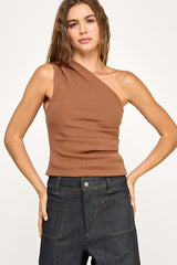 STRETCHY ONE SHOULDER RIBBED TOP - BROWN