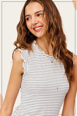 Effortlessly easy and so essential, this timeless sleeveless top from our collection is featured in a ruffle detailing on neck and sleeve. Super stretchy fabric you could wear all day. Pair with a mini skirt or your favorite slouchy jeans. It goes with everything.