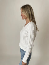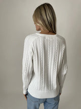A perfect transition piece. This sweater features cable knitting, a v-neckline and is available in navy and white. To complete your look, pair it with your best pair of denim!