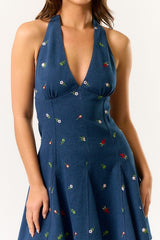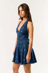 This Denim Mini Halter Dress with All Over Floral Embroidery is a sweet take on edgy style. The halter neckline and mini length create a flattering silhouette, while the floral embroidery adds a soft, feminine touch to the structured denim.