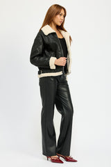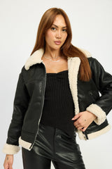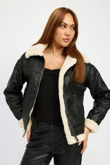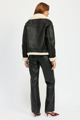 FAUX LEATHER SHEARLING MOTO JACKET - BLACK