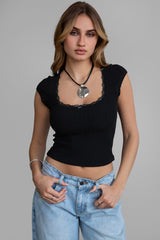 LACE DETAIL SHORT SLEEVE TOP - BLACK
