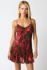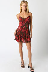 NIA FLORAL RUFFLE DRESS - RED/BURGUNDY