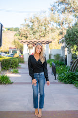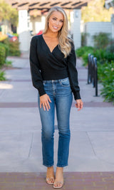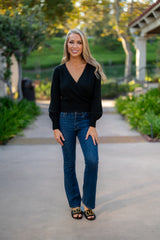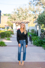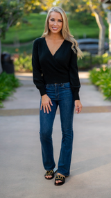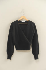 This surplice knit sweater features a flattering V-neckline with an elegant overlapping front. Designed with a relaxed drop shoulder and finished with ribbed cuffs and hem, the fitted waistband adds subtle structure. Perfect for pairing with jeans or skirts, it's ideal for cozy evenings and casual outings alike.